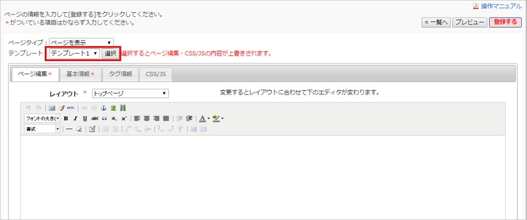 ページ作成時に設定したテンプレートを使用できます。
